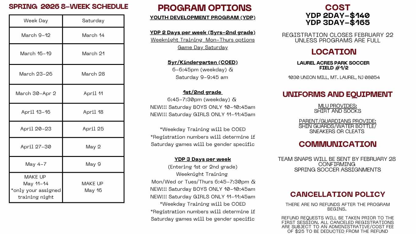 YDP is an 8-week program, with 16 sessions or 24 if you choose 3 days a week weather permitted. See schedule above.