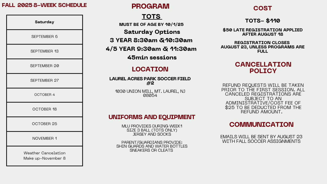 The Tots program is an opportunity to introduce your child to soccer by developing their motor, ball, and listening skills.